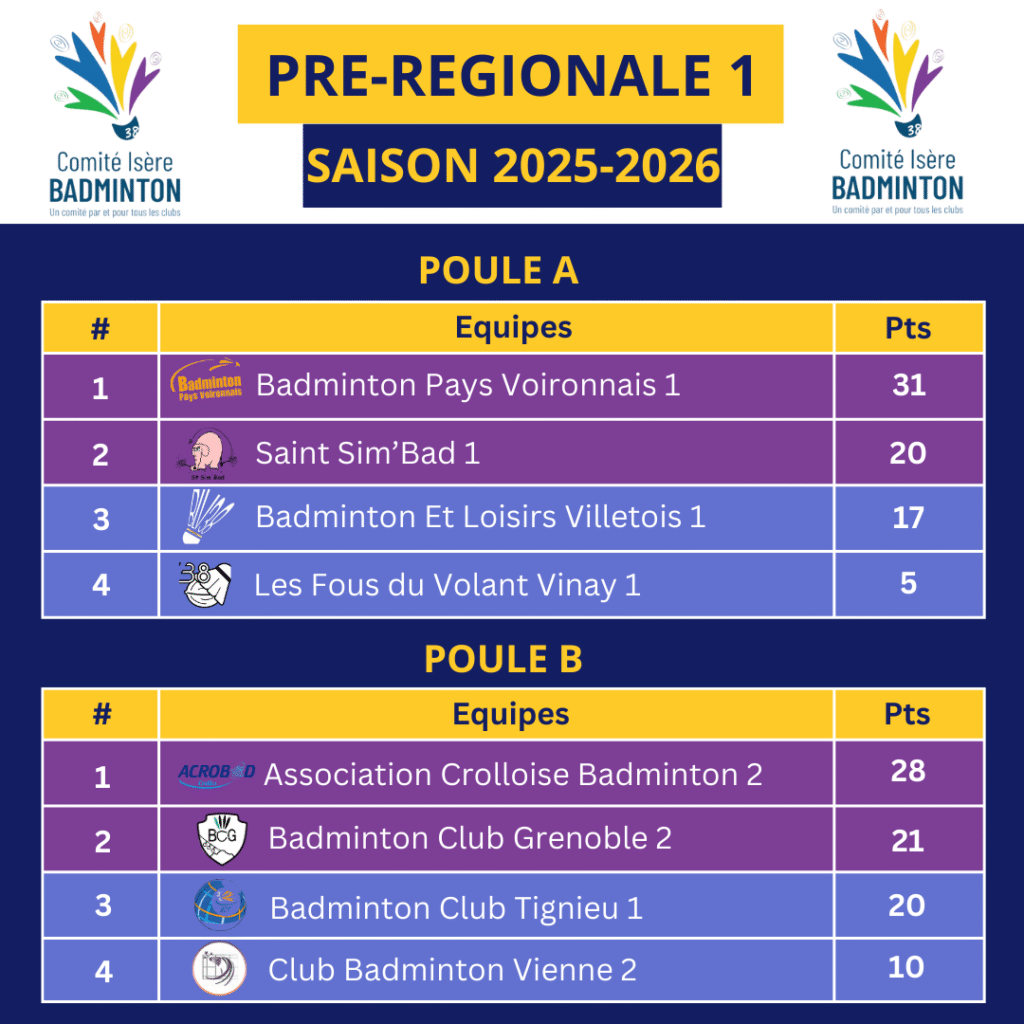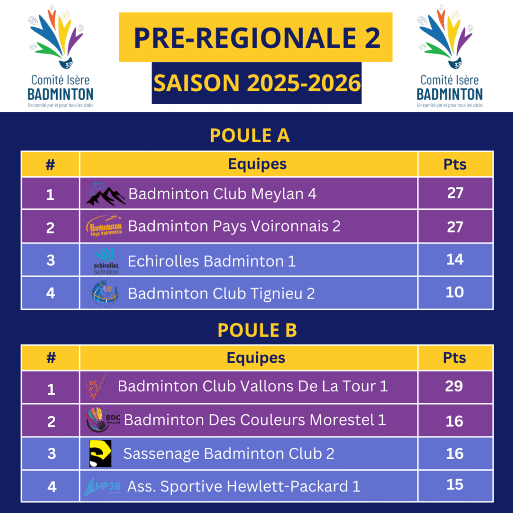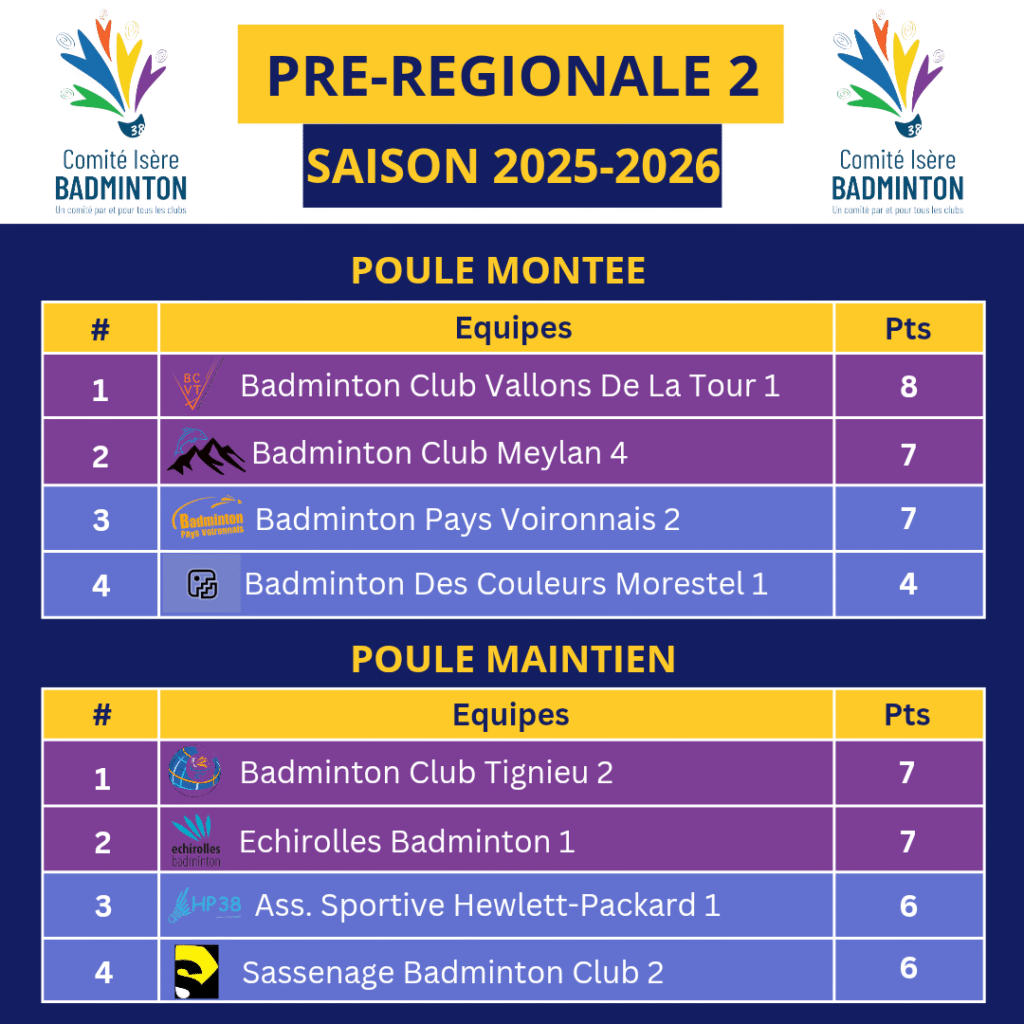 Ce dimanche 14 Décembre 2025 avaient lieu les J5 et J6 des interclubs Pré-Régionaux 2025-2026. Marquant la fin de la première phase de groupe. En PR1 comme en PR2, les deux premiers de chaque poule accèdent à la poule de montée et les 2 derniers sont en poule de maintien. De belles rencontres ont eu lieu et certains classements sont très serrés (Sassenage 2 et Morestel 1 ont dus par exemple être départagés au setaverage de la rencontre particulière pour accession à la poule de montée de la PR2 !).