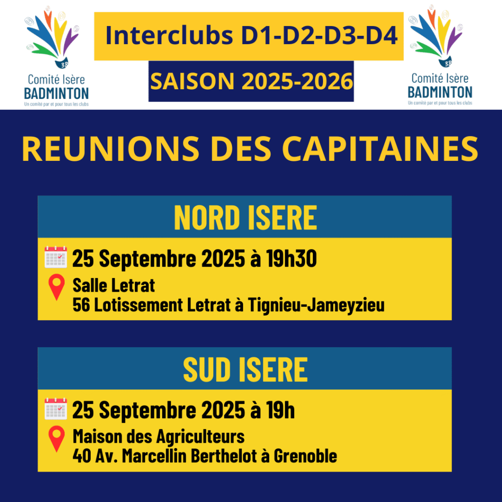 La saison des interclubs reprend ! Et le Comité de l’Isère convie les capitaines des équipes des divisions D1 à D4 à une réunion présentant les Interclubs Départementaux version 2025-2026. Deux réunions en parallèle, une à Grenoble et une à Tignieu.